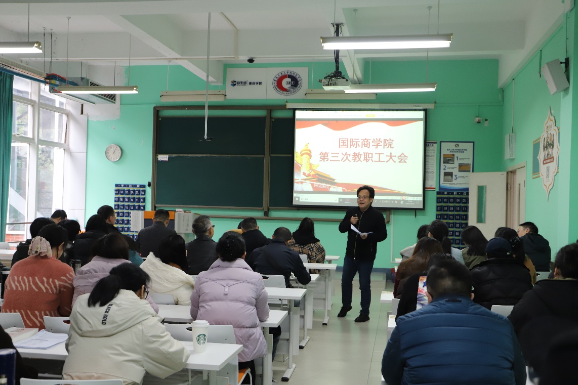 2025年12月19日,国际商学院在502教室隆重召开工会会员大会暨教职工大会换届选举及会议室召开校工会会员代表、校教代会代表选举大会。本次大会是学院教职工政治生活中的一件大事,旨在凝聚各方力量,推动学院各项工作迈向新台阶。会议由党总支书记李大鹏同志主持,学院全体教职工参加会议。