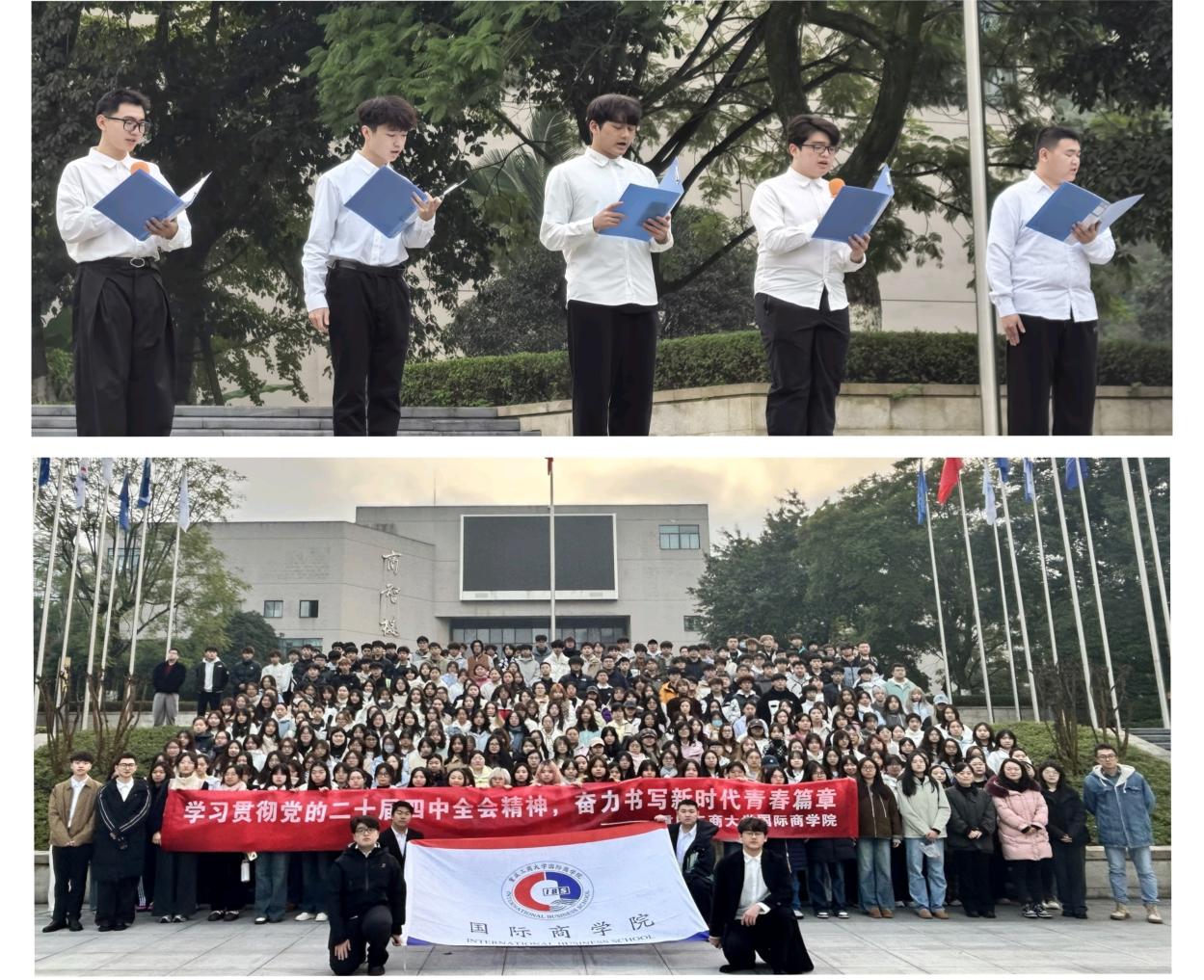 2025年11月24日7时30分,重庆工商大学国际商学院在南岸校区含弘广场庄严举行“学习贯彻党的二十届四中全会精神奋力书写新时代青春篇章”主题升旗仪式。全院大一新生及大二入党积极分子共同参与了这场融爱国主义教育与专业使命启迪于一体的庄严仪式。